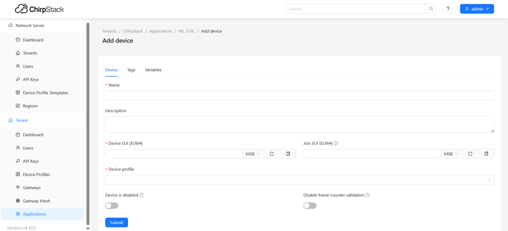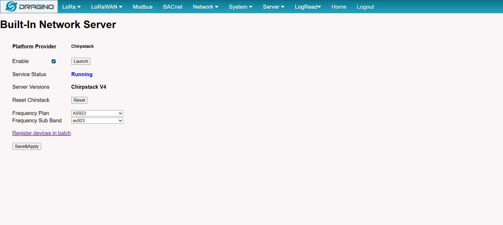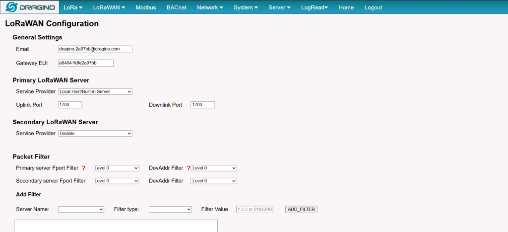 Karena kita akan menggunakan ChirpStack bawaan dari gateway, maka pada pengaturan LoRaWAN Server: